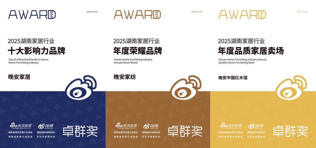 在备受瞩目的卓群奖颁奖环节,晚安家居集团凭借其卓越的综合实力与行业影响力,一举斩获三大重磅奖项:“2025湖南家居行业十大影响力品牌 ——晚安家居”“2025湖南家居行业年度荣耀品牌——晚安家纺” “2025湖南家居行业年度品质家居卖场 ——晚安·中国红木馆”。